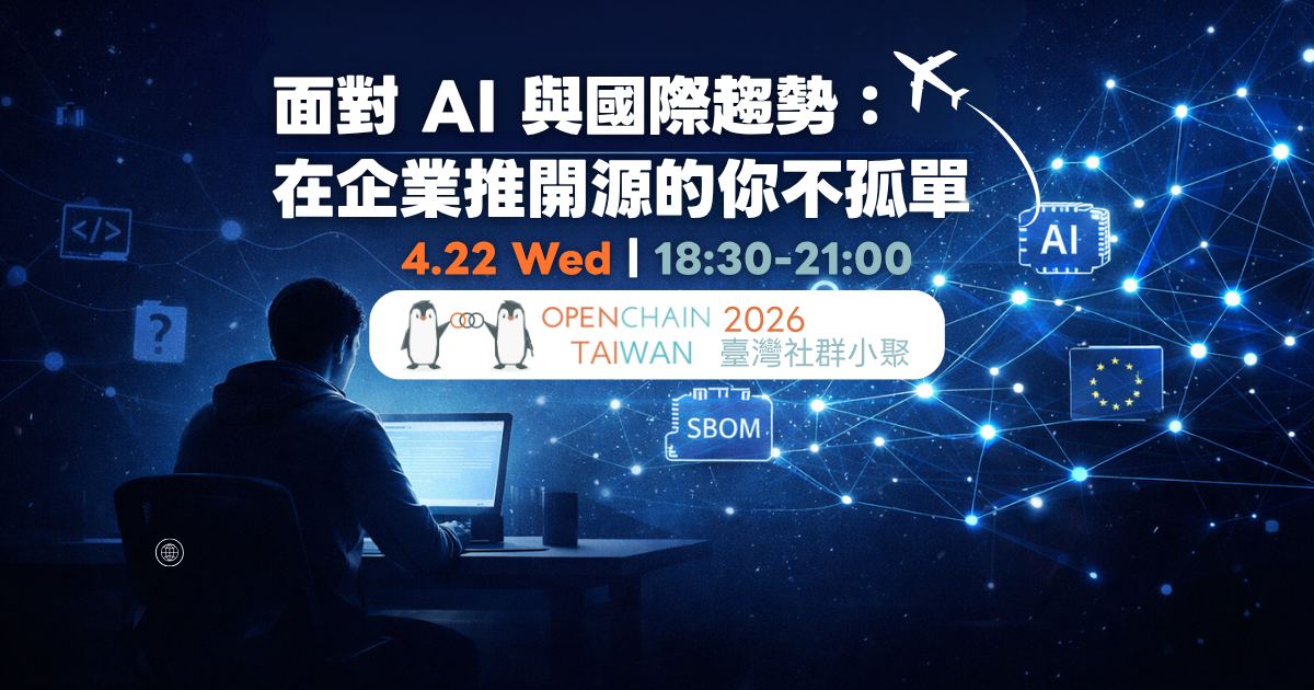 本次小聚將介紹 OpenChain 專案與其最新發展,並邀請具備國內外實務經驗的講者,分享第一線觀察。除了過往在產業中逐漸普及的 SBOM(Software Bill of Materials)與 OSPO(Open Source Program Office)外,也將延伸討論 AI 時代下開源治理的新挑戰與因應方向。